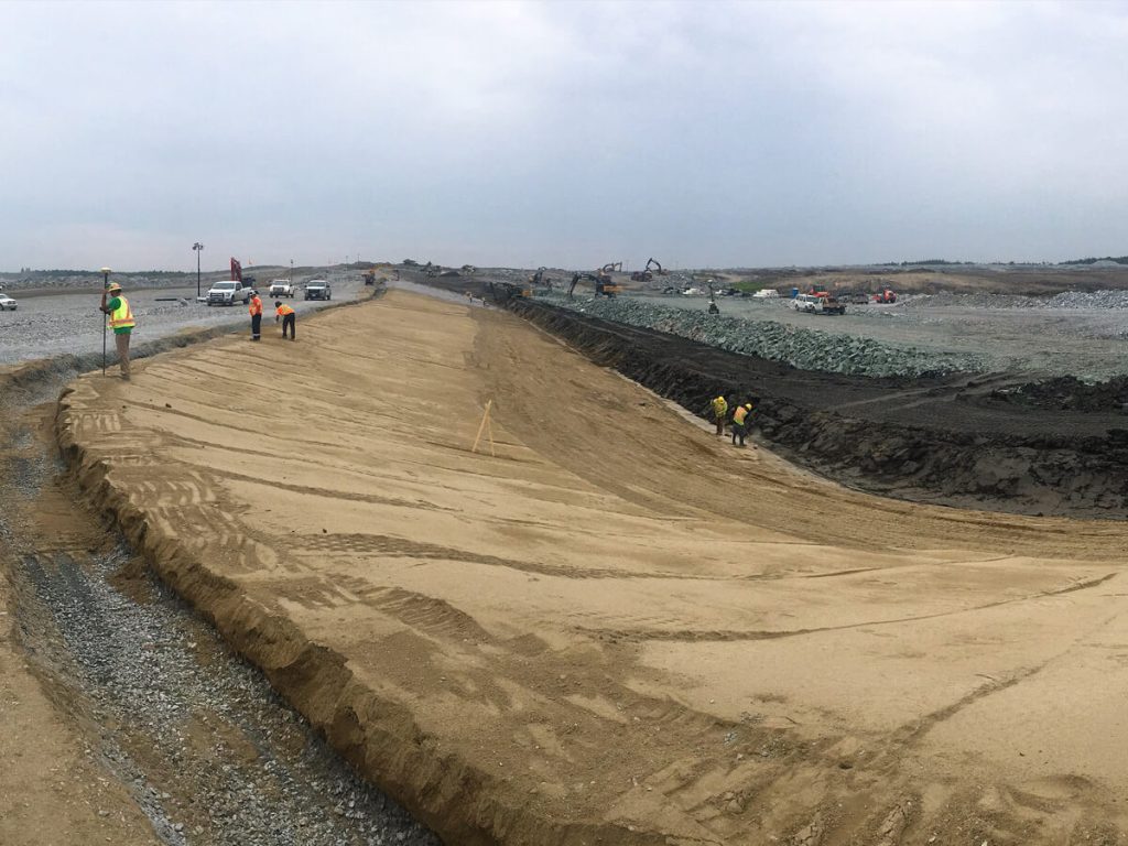 This project entailed the construction of clay core dams with rock shells in areas with deep saturated organic layers. At the outset, organic material was stripped to find competent ground. Once achieved, a key trench was excavated and clay core placement began. Horizontal and vertical filters and relief drains were constructed simultaneously with the core. Placement of rock for the upstream and downstream shells followed lifts of core and filter placement as required. Geotextile, geomembrane liners, and concrete cloth were also laid as part of the design. Compliance with criteria such as maximum lift elevation differentials between materials and a stringent quality control program for soils and compaction testing were critical during construction.